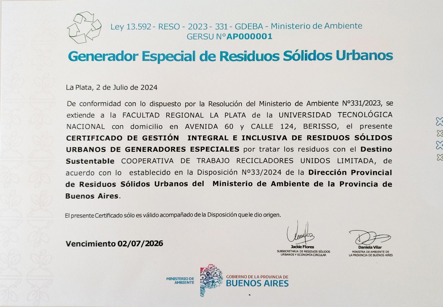 Este jueves 4 de julio la UTN La Plata recibió el primer Certificado de Generador Especial de Residuos Sólidos Urbanos (GERSU) por parte de la Subsecretaria de Residuos Sólidos Urbanos y Economía Circular del Ministerio de Ambiente de la Provincia de Buenos Aires.